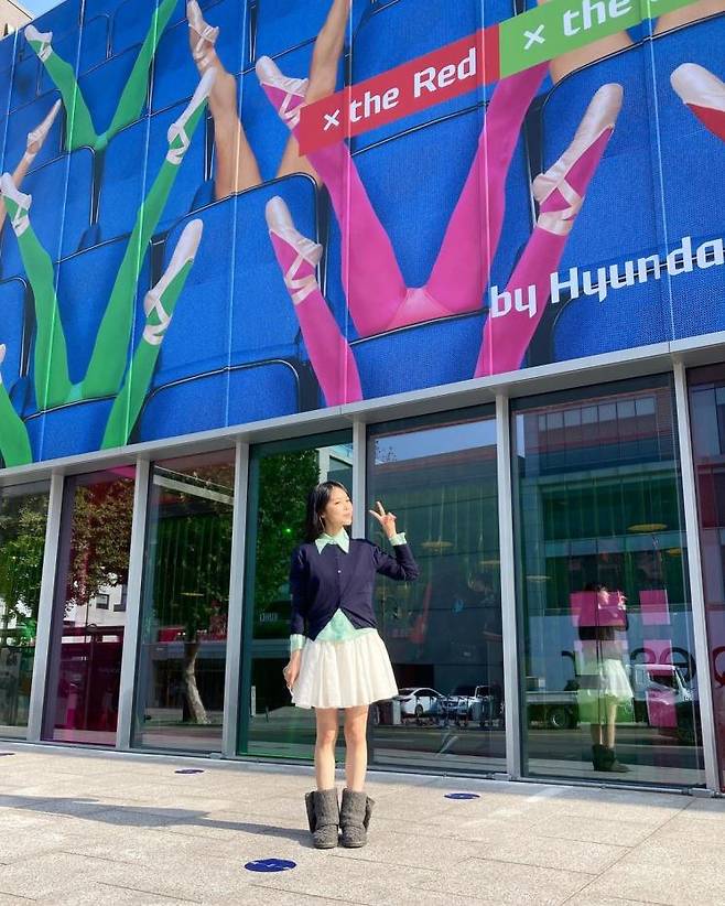 독특한 노래와 귀여운 이미지로 많은 사랑을 받고 있는 미노이! 와이드 카라의 민트색 카라와 네이비 카디건에 화이트 미니 스커트로 교복이 생각나는 룩을 완성했다. 이렇게만 끝내면 밋밋하고 재미없쥐~ 벌키한 어그부츠st슈즈를 더해 귀여움을 더욱 업했다.