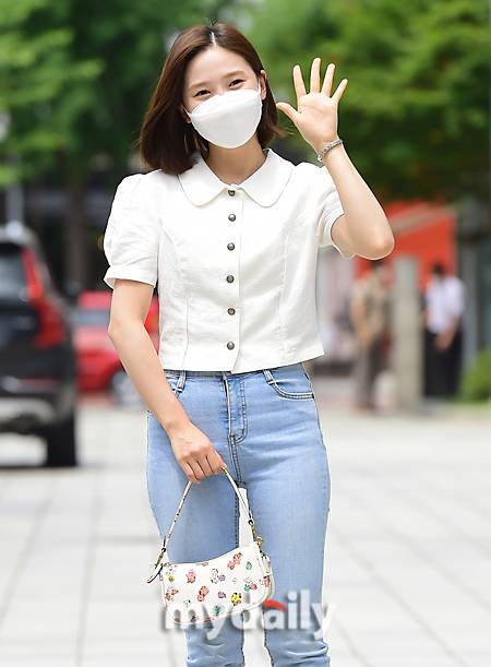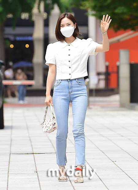 효정은 귀여운 둥근 카라가 달린 하얀 블라우스에 연청 스키니진을 매치했다. 화이트와 데님의 조합으로 청량한 매력이 묻어나는 출근길 패션이다. 이와 함께 스트랩 힐과 미니 숄더백으로 시원해 보이는 스타일링을 완성했다. 특히 늘씬한 몸매를 뽐내며 걸어오는 모습도 화보 같아 감탄을 자아낸 효정이다.