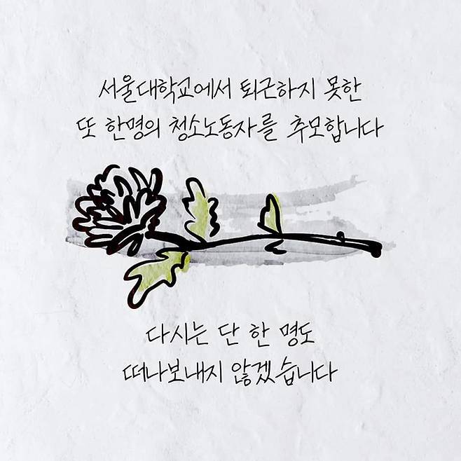 ‘비정규직 없는 서울대 만들기 공동행동’과 민주노총 전국민주일반노동조합 서울대 시설 분회 등은 10일 ‘서울대 기숙사 청소노동자 사망 사건에 대한 진상규명과 올바른 대응을 촉구하는 시민사회 연서명’을 진행한다고 밝혔다. 서명 결과는 서울대 총장실과 서울대학교 인권센터에 전달될 예정이다.