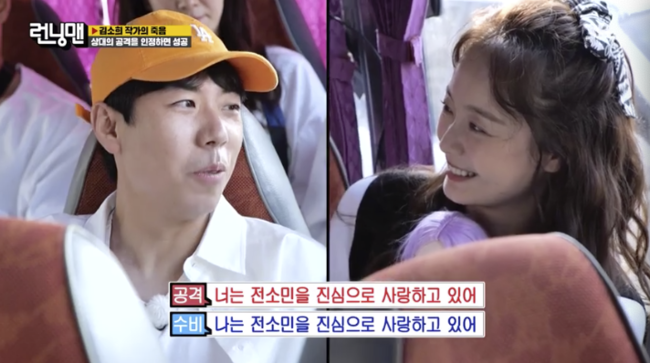 전소민은 러브라인 앞에서 오히려 당당했다. 그는 옆에 앉은 양세찬에게 “넌 전소민을 진심으로 사랑하고 있어”라고 떠봤고 양세찬은 “난 전소민을 진심으로 사랑하고 있어”라고 그대로 답했다. 그리고는 오히려 지석진에게 “넌 전소민을 진심으로 사랑하고 있어”라고 공격해 그를 멋쩍게 만들었다.