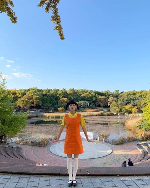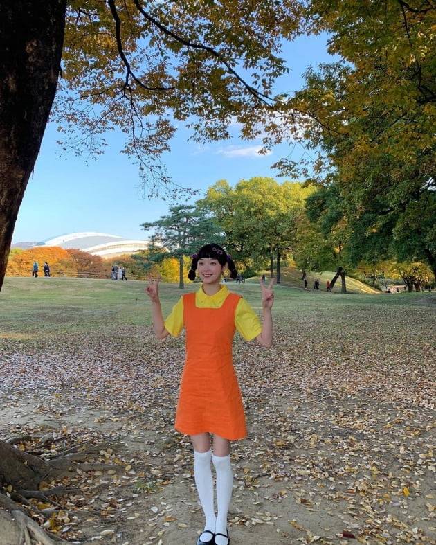 이유미는 29일 자신의 인스타그램에 "#happy halloween. 도망쳐서 죄송해요. 너무 부끄러워서 그랬어요. #Squid game #영희"라는 글을 올렸다. 함께 게시한 사진 속 이유미는 핼로윈데이를 맞아 넷플릭스 '오징어 게임' 속 술래 인형 영희로 분장한 모습. 노란색 티셔츠에 주황색 치마를 입고 양갈래로 머리를 땋은 모습이 귀엽고 사랑스럽다. 머리에는 '오징어 게임'의 시그니처와 같은 '○△□' 모양의 핀을 해 눈길을 끈다.