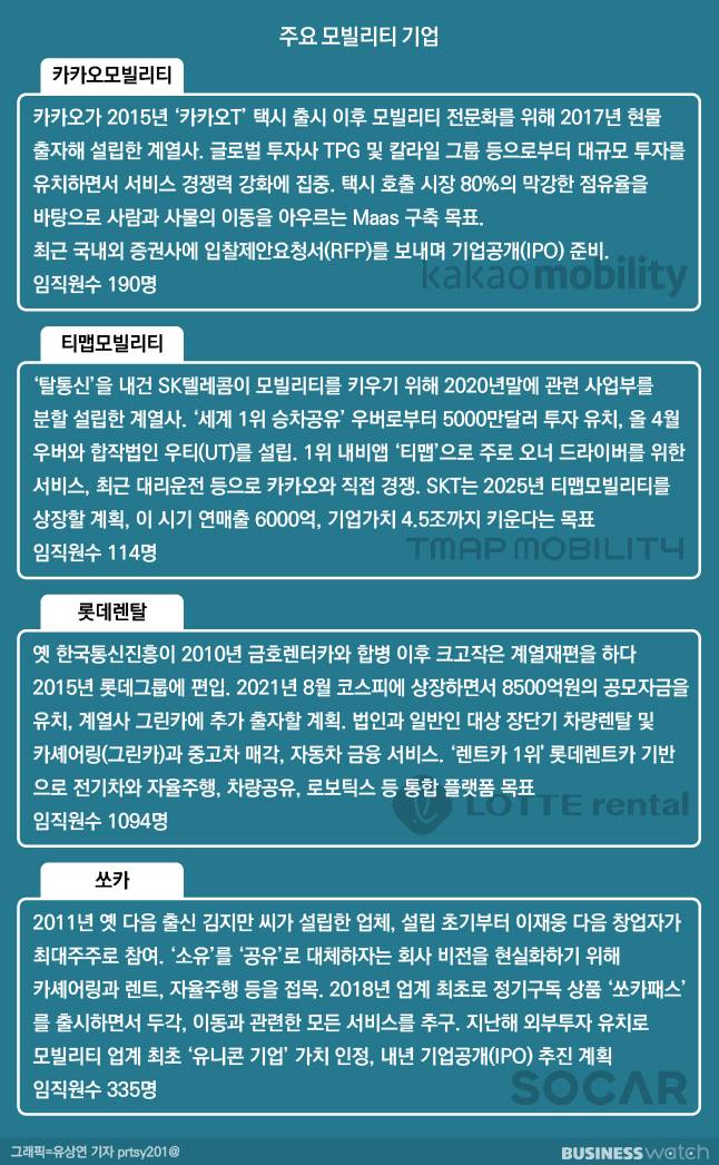 이로써 국내 모빌리티 대표 주자인 카카오·티맵·쏘카가 상장을 향해 나란히 시동을 건 것이다. 렌트카 사업으로 관록을 쌓은 롯데렌탈까지 경쟁에 뛰어들면서 모빌리티 시장을 둘러싼 각축전이 예상된다.