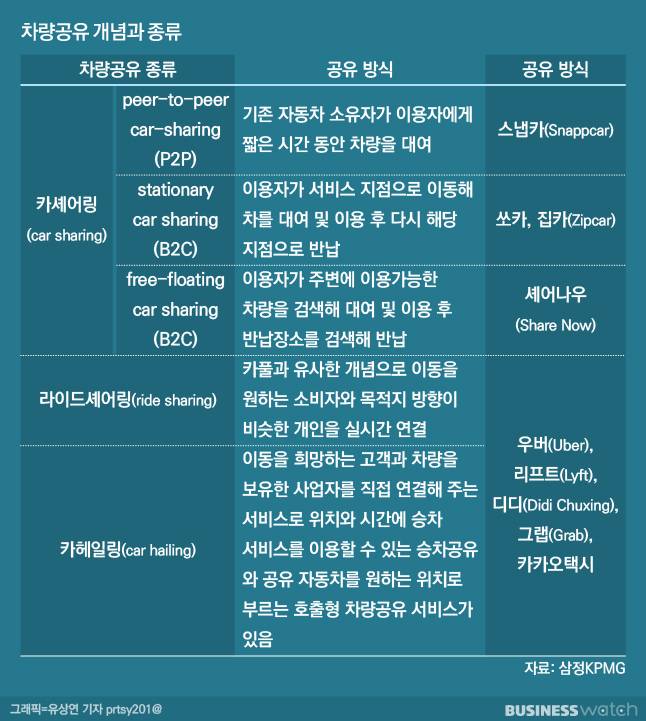카카오가 선보인 차량공유 서비스를 라이드 헤일링(Ride Hailing)이라고 한다. 즉 손님과 택시를 직접 연결하는 것이다. 차량공유는 크게 카셰어링과 라이드셰어링, 카헤일링으로 구분한다. 최근 모빌리티 서비스 업체들은 특정 방식에만 머물지 않고 다양한 서비스를 동시에 제공하면서 영역을 확장하고 있다.