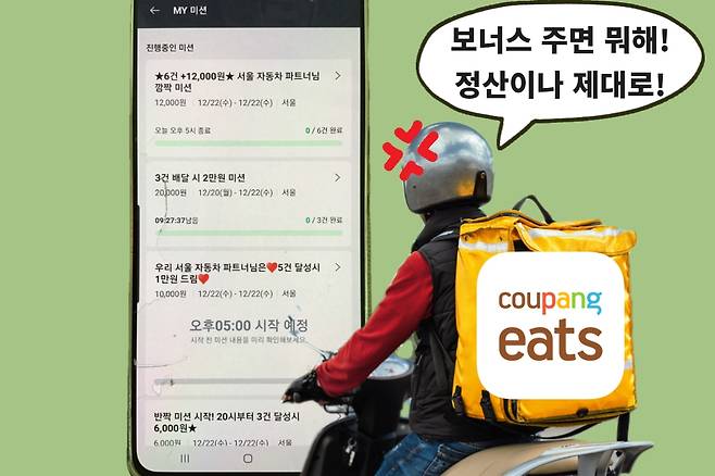 [헤럴드경제=김민지 기자] “쿠팡이츠가 하루에 몇 만원짜리 미션을 여러개 주면 뭐합니까…제대로 정산을 해주질 않는데.”(쿠팡이츠 배달파트너로 근무하는 A씨)