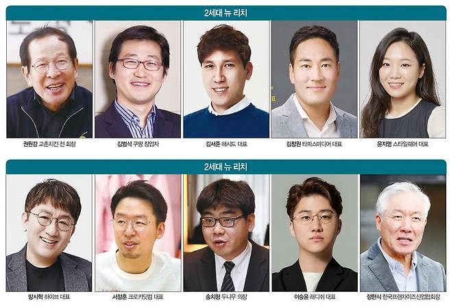 2000년 IT 벤처 붐은 한국 사회에 수많은 1세대 뉴 리치를 등장시켰다. 이해진 네이버 창업자, 김범수 한게임 창업자, 이재웅 다음 창업자 등이 대표 사례다. 이후 IT, 게임, 화장품 업종 등에서 성공한 기업가들이 나왔지만 일부 개인의 성취에 그쳤다.