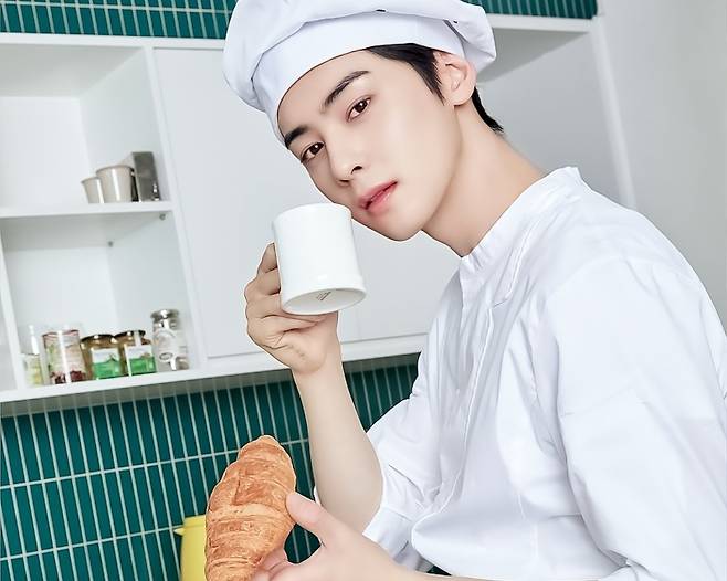 차은우는 요리사 복장에 청바지와 앞치마를 착용했습니다.