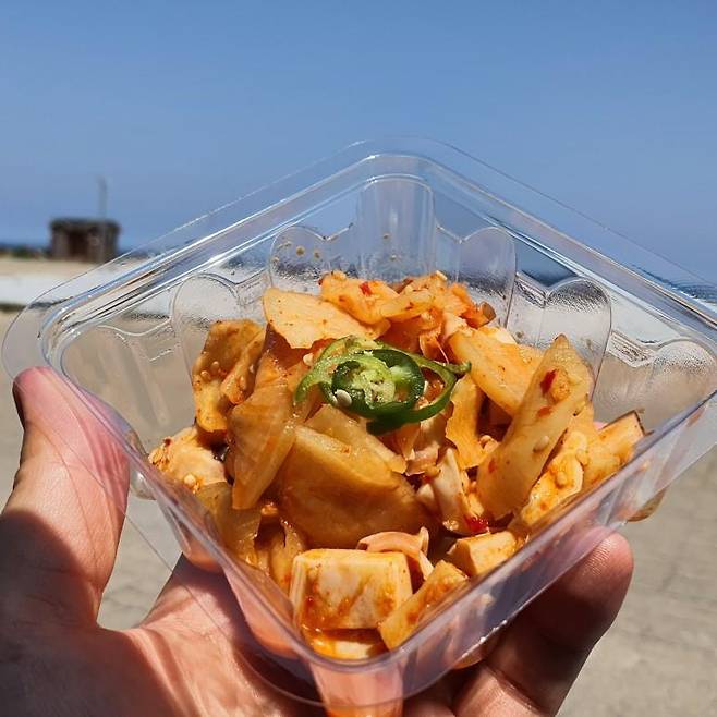 예상보다 맛있었던 오징어 무침이었어요. 색이 연해서 싱거울 줄 알았는데 생각보다 맛이 강해서 깜짝 놀랬어요. 김밥이 생각했던 정도의 맛이라면 오징어 무침은 생각보다 맛있었어요. 퍽퍽한 김밥과 주먹밥을 오징어 무침이 그나마 잡아주는 역할을 했습니다.