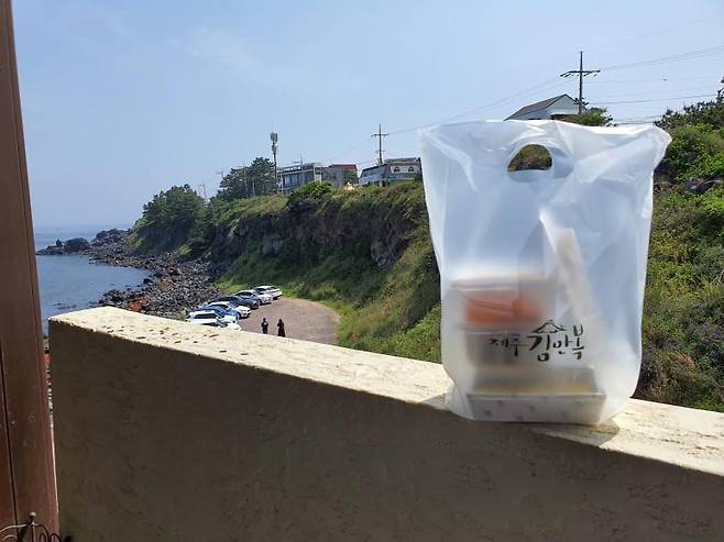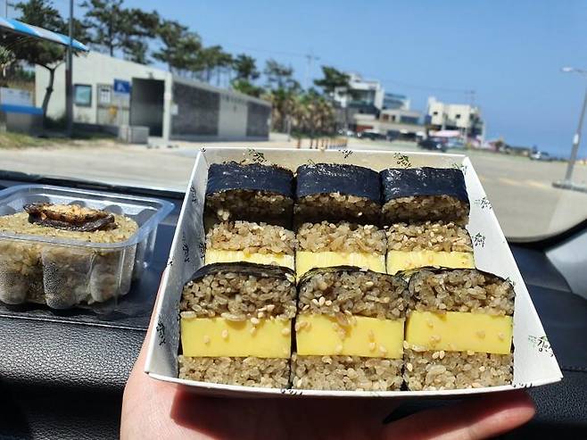 실내에 사람도 너무 많고 날이 너무 좋아서 해변에서 소풍 느낌으로 먹기 위해서 포장을 했습니다. 김밥을 들고 바다 배경으로 한 컷 찍었는데 날씨가 정말 예술이네요.