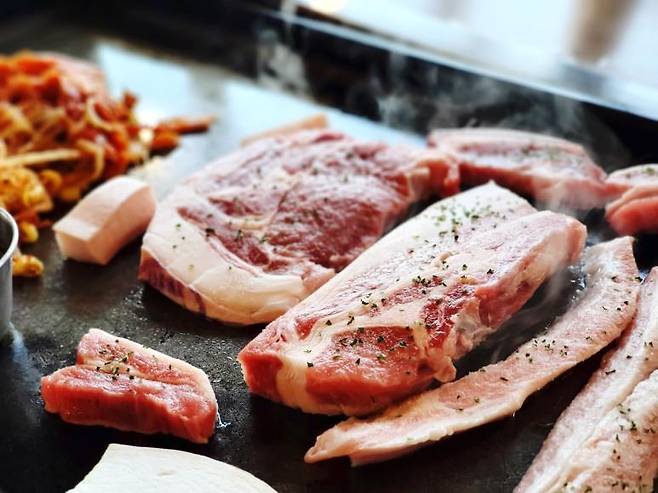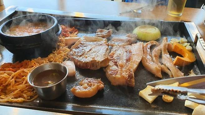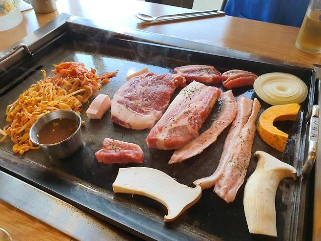 1인분 가격은 크게 차이는 없지만 근고기로 주문을 하면 다른 식당에 비해서는 가격이 저렴합니다. 흑오겹 / 흑목살 / 특수부위 구성의 한판이에요. 두툼한 고기가 빛깔이 너무 핑크 핑크합니다. 서귀포 올레시장의 먹고정에서 먹지 못했던 흑돼지를 이번에서야 먹어보네요. 철판 위에 신선한 고기와 김치 그리고 콩나물까지 셋팅 완료~~