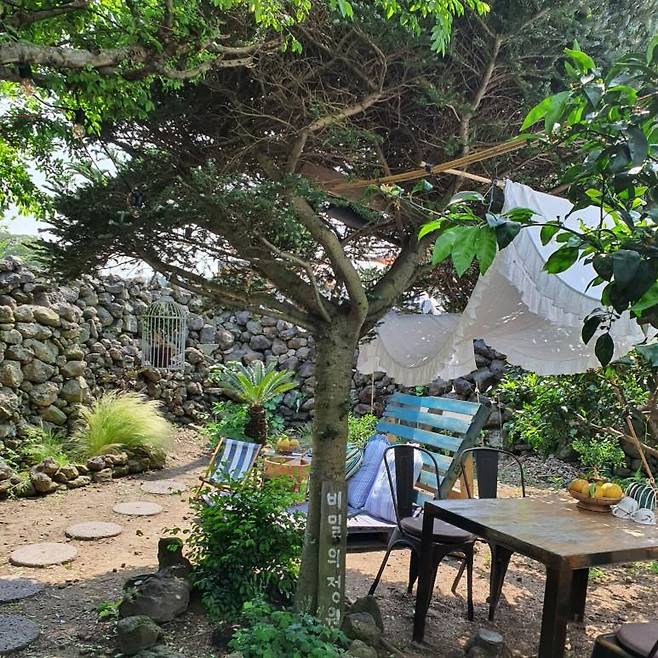 입구 돌담길을 따라서 비밀의 정원 공간이 있습니다. 마치 피크닉을 나온 듯한 기분으로 커피 타임을 즐기기에 좋은것 같아요. 다만 날이 더워지다 보니 의외로 커피를 즐기는 분들은 없더라구요.