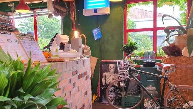 들어가는 입구부터 시선을 확 사로 잡아요. 왼쪽 건물은 아마 사장님 부부가 사시는 자택이고, 빨간프레임의 창문이 잔디공장의 CAFE 건물입니다. 초록과 레드 컬러의 조합이 너무 좋아요. 곳곳에 빈티지한 소품들이 놓여있어서 들어가는 입구부터 실내에 대한 기대감에 설레이네요.