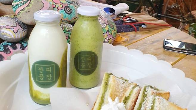 잔디 스무디는 바나나, 망고, 아몬드 그리고 시금치를 넣어 만든 스무디 음료입니다. 초록 초록한 느낌이 건강해지는 느낌이죠?? 달달한 음료에 시금치가 첨가 되어서 먹으면서도 건강해지는 느낌의 음료일것 같아요. 달달하면서 상콤한 느낌의 맛이었습니다. 잔디잼 토스트는 카야잼에 녹차를 넣은 디저트입니다. 녹차의 향이 강하지 않아서 녹차를 잘 못드시는 분도 달달한 맛으로 먹기 너무 좋았어요. 다만 양이........