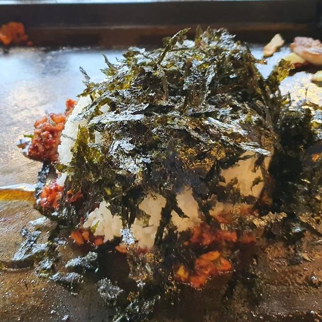정신없이 흑돼지를 헤치우고 나서 마무리입니다. 빨갛게 양념되어진 김치위에 밥을 올리고 조미김까지 듬뿍 올려줍니다. 이제 다시 한번 2차전 시작이네요. 매콤 새콤한 김치가 어우러져 고기 한 점과 같이 먹음 꿀맛입니다.