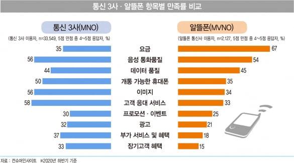 물론 알뜰폰 서비스가 통신 3사에 비해 아쉬운 점도 많다. 컨슈머인사이트가 통신 3사와 알뜰폰 이용자의 만족도와 추천 의향을 비교한 결과 알뜰폰은 요금과 음성 통화 품질, 데이터 품질에 외 나머지 7개 항목에서 통신 3사에 밀렸다. 통신 3사는 고객 응대 서비스, 장기 고객 혜택, 부가 서비스 및 혜택 항목에서 알뜰폰 만족도의 2배에 달했다. 그 밖에 이미지, 광고, 개통 가능한 휴대전화, 프로모션·이벤트 측면에서도 상당한 차이로 앞섰다.