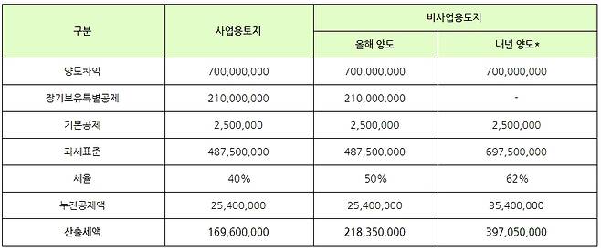 만약 내년부터 비사업용토지에 대한 양도세 중과가 강화된다면 세금은 얼마나 늘어날까요? 장기보유특별공제를 한푼도 받을 수 없고 세율도 20%p중과되기 때문에 같은 비사업용토지라도 양도세가 1억 7,870만원이나 많아지게 됩니다.