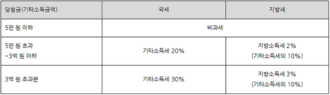 기타소득 금액 5만 원 이하는 세금을 내지 않아도 되고, 5만 원 초과 ~ 3억 원 이하면 기타소득세 20%, 3억 원 초과라면 기타소득세 30%를 내야 해. 참고로 복권 당첨금은 필요경비가 인정되지 않으므로 당첨금이 곧 기타소득 금액이 되는거야.