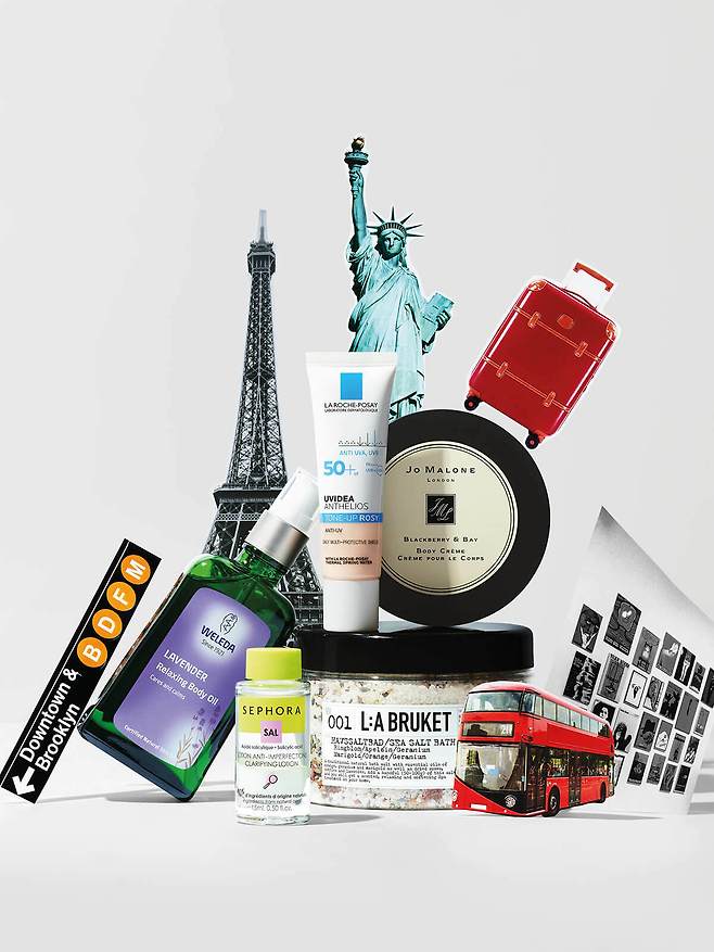 왼쪽부터 시계 방향으로Weleda 라벤더 릴렉싱 바디 오일 라벤더, 스위트 아몬드 오일을 함유한 보디 오일. 숙소에 돌아와 가볍게 스트레칭한 후 보디 마사지할 때 사용한다. La Roche-Posay 유리데아 안떼릴오스 톤업로지 여행지에서는 최소한의 스킨케어와 메이크업을 하는 편이라 자외선 차단제와 메이크업 베이스를 겸할 수 있는 톤업 크림 하나만 가져간다. Jo Malone London 블랙베리 앤 베이 바디 크림 사시사철 꼭 바르는 보디로션. 여행지에서 활력을 더하기 위해 블랙베리 과즙과 월계수잎, 시더우드 등이 조화를 이룬 프루트 계열 향 제품을 선택한다. L:A Bruket 씨 솔트 배스 피로 해소가 여행의 질을 결정하기에 반신욕은 필수다. 장기 여행일 때는 배스 밤보다 솔트 형태가 사용하기 편하다. 손상된 피부를 케어하는 효과가 있는 시솔트와 마리골드, 오렌지 오일 등을 함유한 제품. Sephora Collection 클래리파잉 로션 예기치 못한 피부 트러블이 발생했을 때를 위한 제품. 흔들지 않고 면봉으로 파우더를 살짝 찍어 트러블 부위에 바른다.
