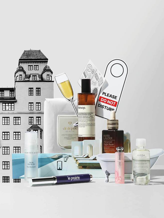 왼쪽부터 시계 방향으로Chantecaille 퓨어 로즈 워터 트래블 사이즈 순도 99.9%의 장미수를 담았다. 스킨케어 첫 단계에 토너로 쓰고, 필요할 때마다 미스트처럼 사용한다. Clé de Peau Beauté 메이크업 클렌징 타올렛 워터프루프 마스카라까지 한 장으로 말끔하게 지우는 타올렛은 여행 필수품. 일정이 짧을 때는 지퍼백에 덜어 간다. Aesop 올루스 아로마틱 룸 스프레이 시트러스 아로마 향은 공간의 낯선 향을 리프레시해주고 활기를 불어넣는다. Estee Lauder 어드밴스드 나이트 리페어 싱크로나이즈드 멀티-리커버리 콤플렉스 물이 바뀌고 시차가 나는 곳에서도 피부를 건강하게 지켜주는 제품. 손상된 피부를 개선하는 리페어 효과를 기대할 수 있다. Aveda 스트레스-픽스™ 컴포지션 오일 샤워 후 몸에 바르거나 두피에 사용할 수 있으며 입욕제로도 쓸 수 있는 멀티 오일. 라벤더 향은 힐링 무드를 배가한다. Dior 어딕트 립 글로우 립밤 입술을 촉촉하게 케어하며 자연스러운 컬러로 발색돼 내추럴 메이크업을 완성한다. La Prairie 스킨 캐비아 퍼펙트 컨실러 여행지에선 선 제품을 바른 후 컨실러로 결점만 커버한다. 메탈 소재 팁으로 마사지도 가능하다.