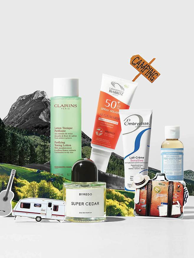 왼쪽 위부터 시계 방향으로Clarins 퓨리파잉 토닝 로션 복합성인 내 피부와 피지 분비가 왕성한 남편 피부에 모두 좋은 제품. 땀으로 얼룩지는 피부를 수시로 닦아낼 때도 유용하고, 피부에도 편안하다. Laboratories de Biarritz by Ontrée 알가마리스 스프레이 쏠레흐 SPF50+ 피부와 바다에 유해한 성분을 배제한 자외선 차단제. 그럼에도 백탁 현상이 심하지 않고 얼굴과 몸에 모두 편하게 사용할 수 있다. Embryolisse 레 크렘 센시티브 피부가 민감한 아기와 어른 모두 사용하기 좋은 보습 크림. 환경이 바뀐 여행지에서 갑작스러운 피부 트러블을 진정시키는 데도 효과적이다. Dr. Bronner’s 베이비 언센티드 퓨어 캐스틸 솝 임산부와 신생아도 사용 가능하며, 얼굴과 몸 그리고 모발까지 씻을 수 있는 만능 리퀴드 솝. 향이 거의 없어 아기와 함께 사용하기에도 적절하다. Byredo 슈퍼 시더 오 드 퍼퓸 아기 때문에 향수를 자주 뿌리진 않지만 휴가 기분을 고조하기 위해 향수도 하나 챙긴다. 가벼운 우드 계열이라 자연 속에서도 이질감 없이 어우러지는 향이다.