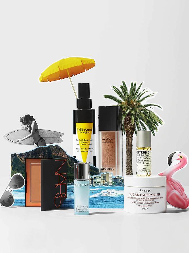 왼쪽부터 시계 방향으로Nars 브론저 라구나 얼굴은 가급적 자외선에 직접 노출을 피하기 때문에 태닝된 몸에 비해 한 톤 밝을 수밖에 없다. 하지만 이 제품으로 셰이딩만 더한다면 건강한 여름 피부를 연출할 수 있다. Hair Rituel by Sisley 프로텍티브 헤어 플루이드 태양 아래 나서기 전 이 제품을 바르면 두 종류의 선 필터가 UVA와 UVB로부터 모발을 보호하고, 모발 큐티클 결합을 회복해준다. Chanel 레 베쥬 워터-프레시 틴트 촉촉하면서 가볍고 자연스러운 태닝 피부를 연출할 수 있는 파운데이션. Le Labo 시트롱 28 종일 코코넛 오일 향에 취해 있는 여행지에선 시트러스 향이 신선하게 감각을 깨운다. 단순한 레몬 향이 아니라 머스크와 진저, 재스민이 어우러져 매력적이다. Fresh 슈가 페이스 폴리쉬 매끄러운 태닝 피부를 위해 2~3일 전 스크럽은 필수다. 고운 슈거 성분으로 피부 자극 없는 스크럽이 가능하며 촉촉하고 부드러운 마무리감이 압권인 제품. Amorepacific 모이스춰 플럼핑 컨센트레이트 앰플 고농축 뱀부 넥타 성분이 보습과 탄력 케어를 하는 제품. 5ml 사이즈라 휴대도 편하고, 잔뜩 건조해진 피부에 기존 세럼만으로는 부족한 수분을 채울 때 유용하다.