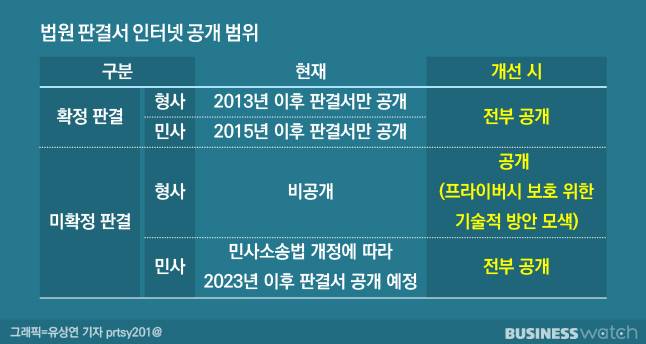 확정판결 중에 형사는 2013년 이후, 민사는 2015년 이후 판결서만 인터넷으로 볼 수 있다. 미확정 판결은 형사는 비공개, 민사는 작년 12월 민사소송법 개정에 따라 2023년 이후 판결서만 점차 공개될 예정이다.