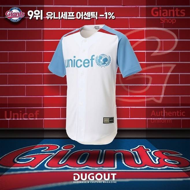 2011년 롯데가 유니세프 공식 후원 구단이 되면서 착용하게 된 유니세프 유니폼은 눈이 시원해지는 하늘색이 매력적이다. 매월 마지막 주 목요일인 유니세프 데이에 착용하는데 최근 유니세프와의 협약이 10주년을 맞이하며 새로운 디자인으로 내놓기도 했다. 등판에 선수명을 기명하지 않고 등 번호만 마킹하는 것이 특징으로 선수단이 이 유니폼을 착용한 날이면 성적이 상당히 좋아 오랜 시간 사랑받고 있다. 하지만 워낙 독창적인 상품이 많은 탓일까. 단 한 표만 겨우 획득하며 10위를 기록했다.