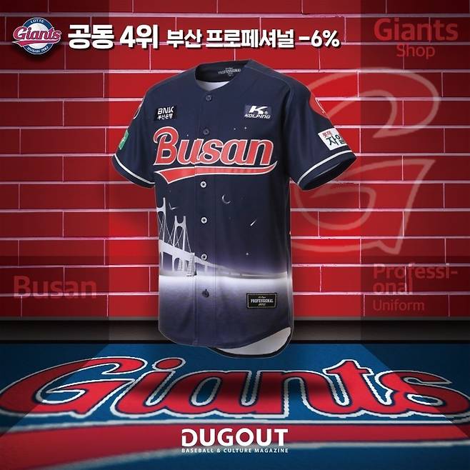 부산의 랜드마크인 광안대교가 시선을 사로잡는 부산 프로페셔널 유니폼은 구단 굿즈 공모전 '놀면 뭐하겠노'의 수상작이다. 광안대교의 야경을 표현하기 위해 남색을 메인 컬러로 사용했다. 오윤석이 이 유니폼을 입고 KBO 최초 만루 홈런 포함 히트 포더 사이클을 기록하며 화제가 되기도 했다. 그러나 화제성과 판매량은 별개였을까. 공동 4위를 기록하는 것에 그치며 아쉬움을 남겼다.