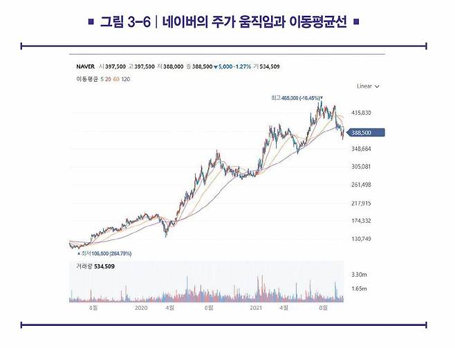 네이버 주가 차트에서 세 개의 이동평균선(20일선, 60일선, 120일선)이 확산과 수렴을 반복하는 것이 보이시나요?