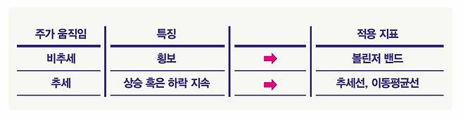 이때는 변동성 지표인 볼린저 밴드*를 통해 저점과 고점을 파악할 수 있습니다. 또 한편으로 주가는 일정한 추세를 따라 움직이기도 합니다.