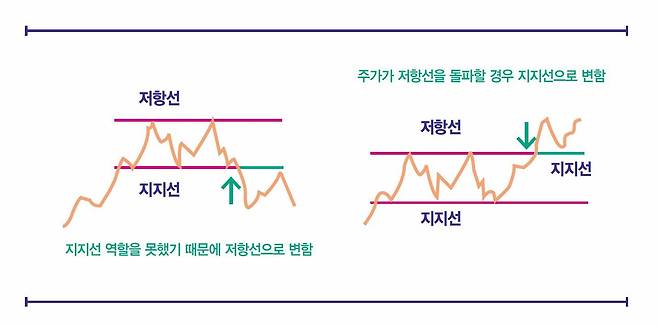 한마디로 지지선과 저항선은 주가의 방향성을 결정짓는 '변곡점'과도 같습니다.