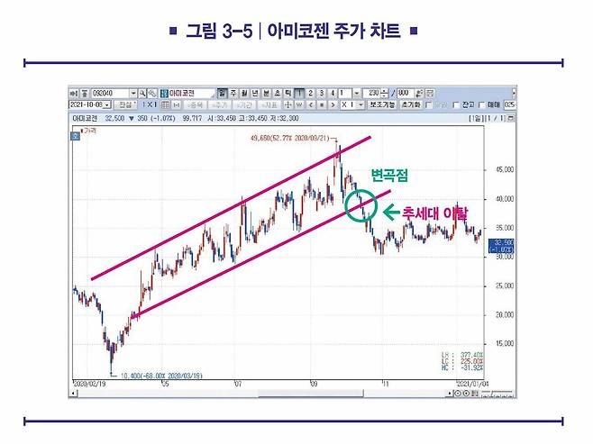 이후 상승 추세대 하단을 뚫고 내려가는 이탈 현상이 발생합니다. 추세가 끝나고 나서는 횡보하는 모습을 볼 수 있습니다.
