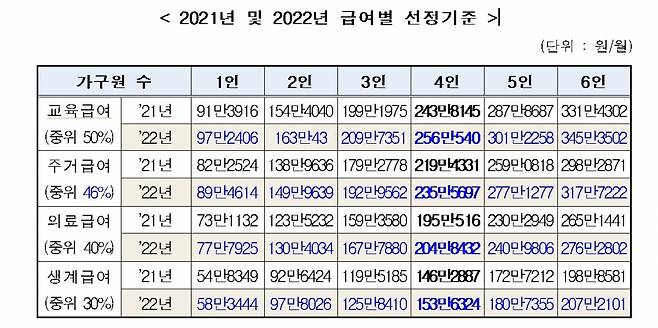 내년 4인 가구 기준 의료급여는 204만 8432원, 주거급여는 235만 5697원, 교육급여는 256만540원 이하일 때 받을 수 있다.