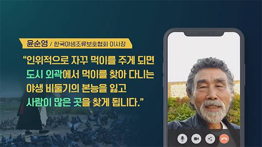 "인위적으로 자꾸 먹이를 주게 되면 도시 외곽에서 먹이를 찾아 다니는 야생 비둘기의 본능을 잃고 사람이 많은 곳을 찾게 됩니다."