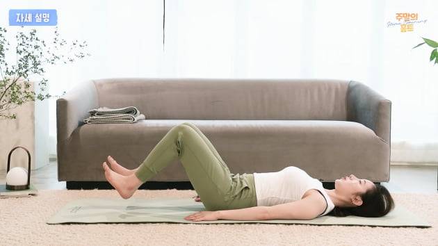 천장을 보고 누운 상태에서 다리를 'ㄱ'자로 들고 발끝은 당겨준다.