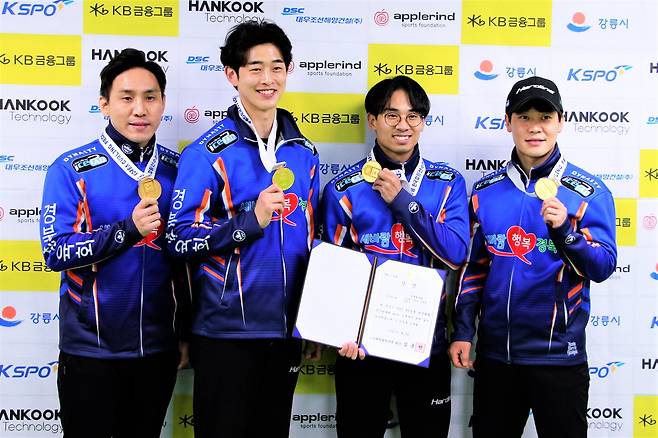 | ▲ 2021 KB금융 한국컬링선수권대회에서 우승한 (왼쪽부터) 경북체육회 김수혁, 김학균, 전재익, 김창민 선수가 포즈를 취하고 있다. |