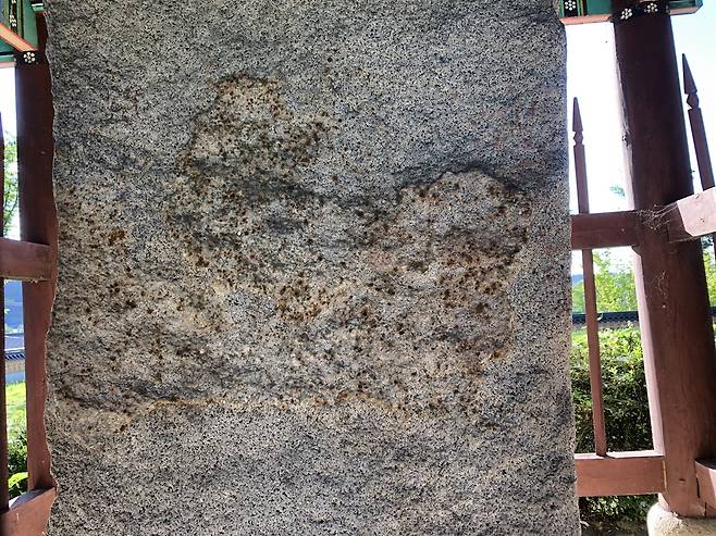 | ▲ 원동산 의견비 앞면 문양 원동산 의견비 앞면에는 개의 형상이 비석의 암석 표면에 자연 문양으로 있어 신기하다. |