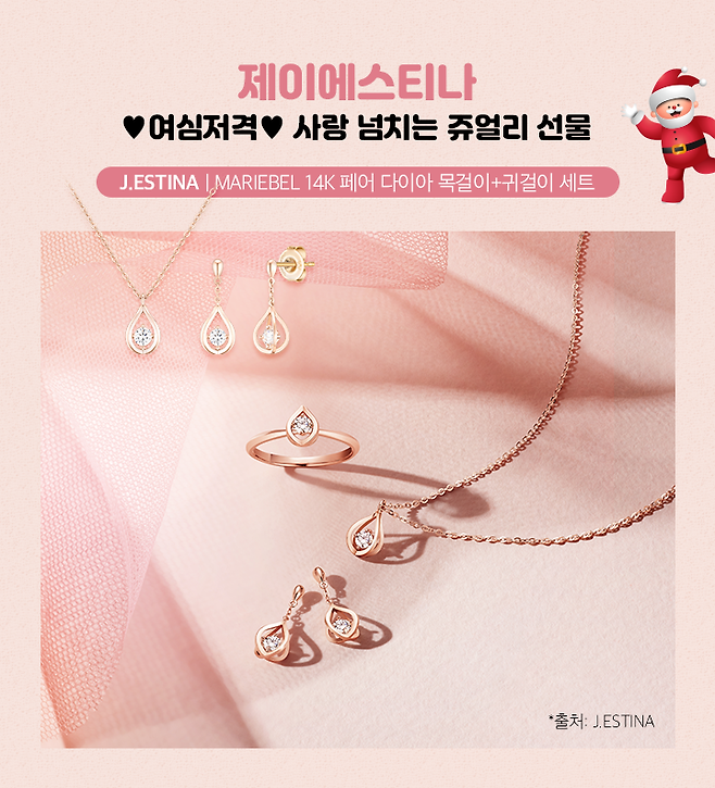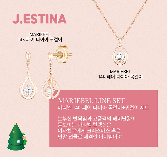 제이에스티나에는 사랑하는 마음을 전달할 주얼리 제품이 상당히 많은데, 그중에서도 에디터가 추천해 주고 싶은 크리스마스&연말 선물 제품은 꾸준히 사랑받고 있는 마리벨 컬렉션인 마리벨 14K 페어 다이아 목걸이&귀걸이 세트야.