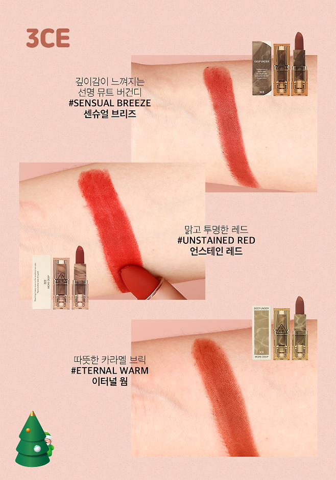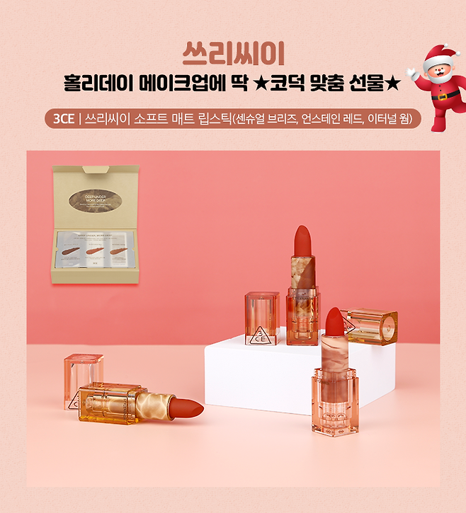 신규 컬러 립 3개로 구성된 쓰리씨이 소프트 매트 립스틱 키트. 코덕에게 선물할 제품을 찾고 있다면 이만한 게 또 없지. 이번에 한정 수량으로 판매하고 있기 때문에 지금 아니면 기회가 없다구. 딥~한 컬러로 구성되어 있어 홀리데이 메이크업은 물론 겨울에 사용하기 딱이야.