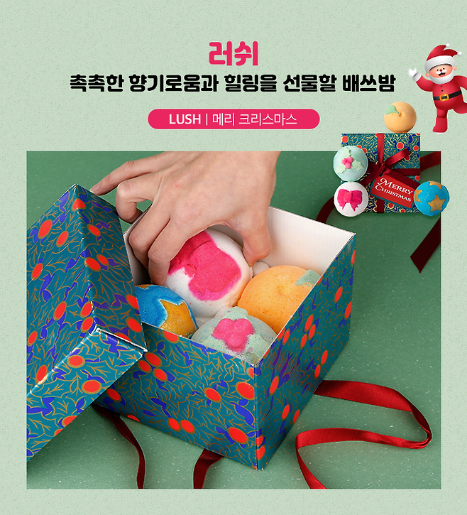 이번에 추천해 줄 크리스마스/연말 선물은 향기만으로도 기분 좋아지는 러쉬 배쓰밤이야. 배쓰밤은 호캉스 혹은 여행지에서 특별하게 보내고 싶을 때 혹은 일상 속 힐링이 필요할 때 등 촉촉한 향기로움으로 로맨틱한 시간을 보낼 수 있어. 크리스마스와 연말엔 호캉스는 물론 여행 많이들 가니깐 욕조에 물을 받아 입욕제로 기분 좋은 힐링하라고 선물하면 너무 좋지 않겠어?