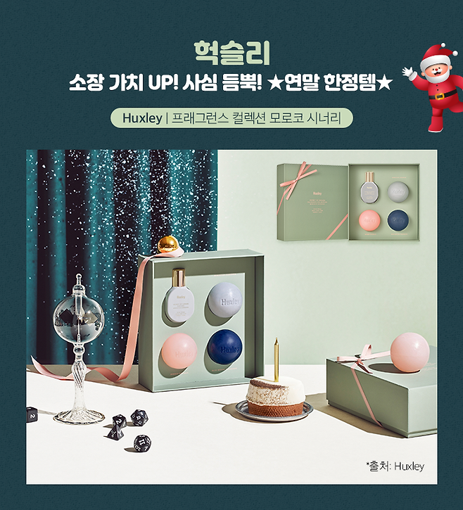 연말 한정 세트 제품은 그 시기에만 구매할 수 있기에 더욱 특별한 선물이 돼. 헉슬리 프래그런스 컬렉션 모로코 시너리는 헉슬리의 5번째 연말 한정 컬렉션으로 퍼퓸 모로칸 가드너와 핸드 솝 트리오로 구성되어 있어. 패키지를 여는 순간 형언할 수 없는 매력의 향으로 늘 가까이 곁에 두고 싶어져.