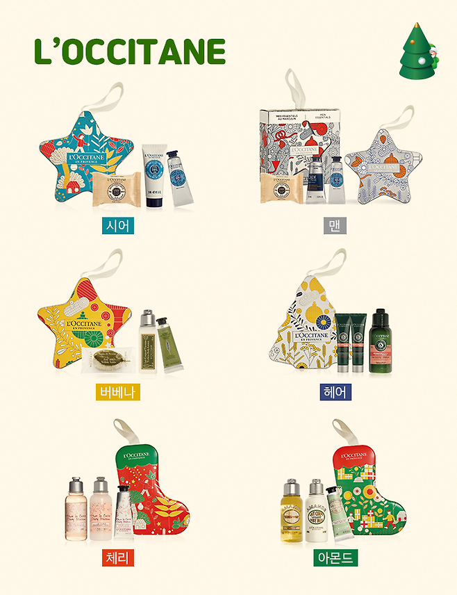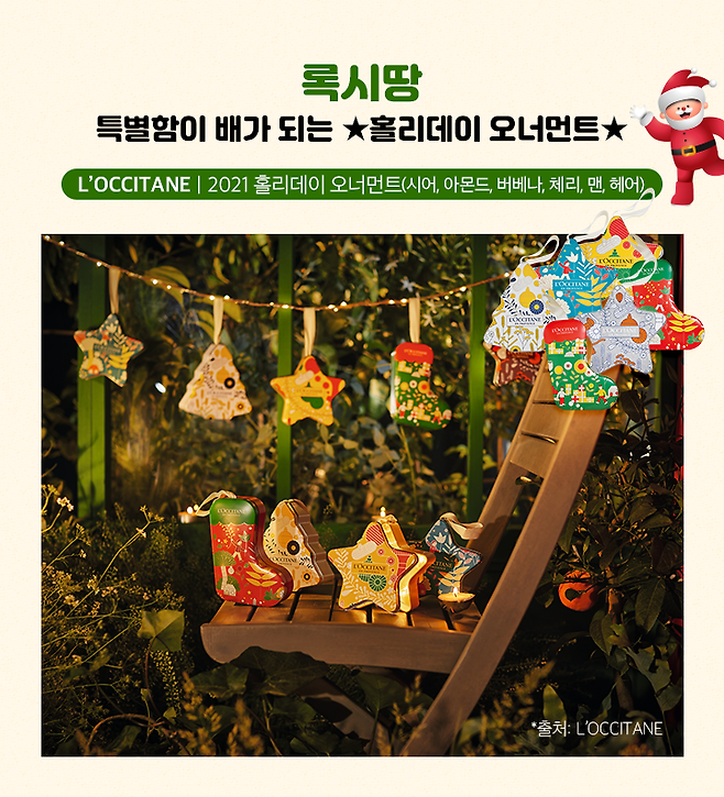 록시땅 2021 홀리데이 오너먼트는 알록달록 6가지 다양한 틴케이스로 구성되어 있는데, 그 안에는 록시땅의 인기 라인인 시어 버터, 아몬드, 버베나, 체리 블라썸, 맨, 그리고 아로마 헤어 라인까지 미니어처 3종이 앙증맞게 들어 있어. 패키지만으로도 크리스마스, 연말 느낌이 물씬 풍기다 보니 특별한 선물이 될 거야★★ 이왕 선물할 거 사는 김에 나 자신에게도 하나 선물해 크리스마스 홈 데코 어때?