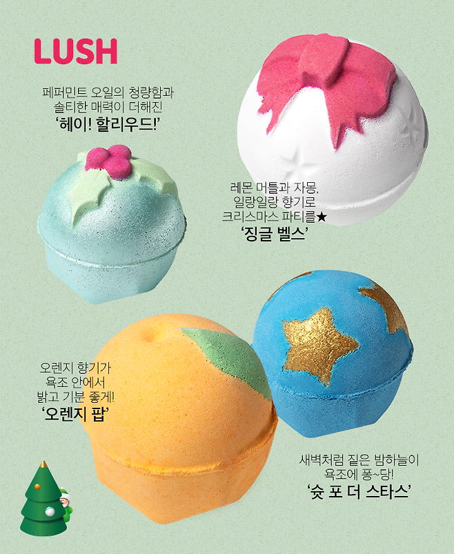 핑크 리본이 특징인 징글 벨스, 밤하늘의 은하수처럼 빛나는 배쓰 아트를 감상할 수 있는 슛 포 더 스타스, 싱그러운 오렌지 향기가 매력적인 오렌지 팝, 크리스마스 트리 오너먼트처럼 귀여운 헤이! 할리우드!까지. 러쉬 메리 크리스마스는 크리스마스를 상징하는 배쓰밤들로 구성된 기프트 세트라 더욱이 선물하기에 딱이야. 주변에 입욕을 좋아하는 분들이 있다면 러쉬 배쓰밤 선물은 실패 제로! 성공률 100%라구.