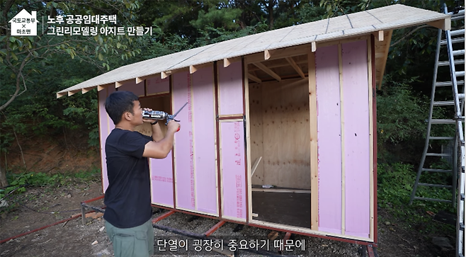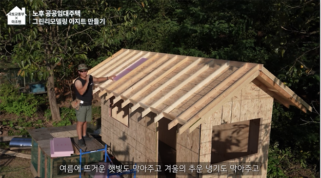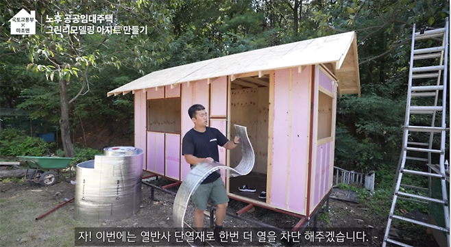 에너지 효율을 높게 해서 난방비 절약은 물론 태양열 패널로 전기도 사용할 수 있는 그린리모델링을 위해 마초맨의 아지트도 본격적인 단열 공사를 시작합니다. 아이소핑크라는 단열재를 사용해서 1차 마무리를 한 후 열반사 단열재를 그 위에 넣어준다고 합니다. 단열 공사에서는 빈틈이 있으면 단열에 굉장히 취약하기 때문에 꼼꼼하게 마무리하는 게 중요합니다. 단열 공사 후 외장합판 작업을 시작합니다.