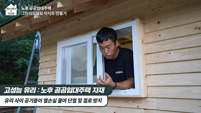 마지막으로 유리 사이 공기층이 열 손실을 줄여 결로를 방지하고 단열을 높여줄 고성능 유리까지 끼워줍니다. 이렇게 해서 추운 겨울 차가운 냉기를 막아줄 이중창과 무더운 여름에 따가운 햇살을 막아줄 지붕, 시원한 파레트 나무로 마감한 그린리모델링이 적용된 마초맨의 아지트 완성!