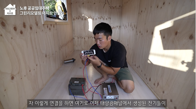 이제 거의 완성 단계에 다다랐는데요. 신재생에너지인 태양광 패널을 활용하여 전기에너지를 사용할 수 있도록 설치하였습니다. 지붕 위에 패널을 설치한 후, 내부에 배터리와 인버터를 설치해주면 되는데, 앞으로 마초맨의 아지트에서 사용하는 모든 전기는 태양광 패널에서 나오는 에너지를 사용할 예정입니다.