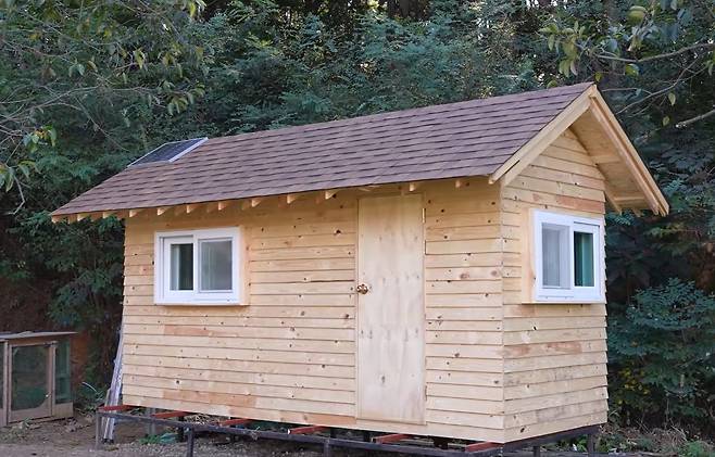 마초맨은 집에 방치되어 있던 캠핑카를 부수고 나무집 짓기를 실현하기 위해 골조를 세우기 시작했는데요. 최대한 저렴하게 만들기 위해서 시중에서 파는 가장 저렴한 목재인 각목으로 골조를 올려주었습니다. 그다음으로 내벽을 두르기 위해 마감재 없이 미송합판9t 짜리로 마감 처리를 한 후 피스를 꼼꼼하게 박아 주고 지붕 작업 시작! 아버지의 도움을 받아 지붕에 필요한 재료를 손질한 후, 서까래와 기둥을 만들어 하나하나 끼워준다고 합니다. 지붕 뼈대도 마찬가지로 피스를 깊숙하고 튼튼하게 잘 박아서 완성되면, 지붕에 올린 합판을 재단하고 지붕 작업은 1차 마무리를 합니다.