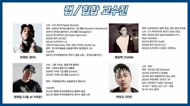 지난 13일 한양대 미래인재교육원에 따르면 최근 래퍼 쿤타를 비롯해 힙합듀오 가리온의 멤버 나찰, Mnet <쇼미더머니2> 준결승 진출자 VMC 소속 우탄, 가수 윤비 등이 힙합 전문 교육과정의 교수로 임용됐습니다.