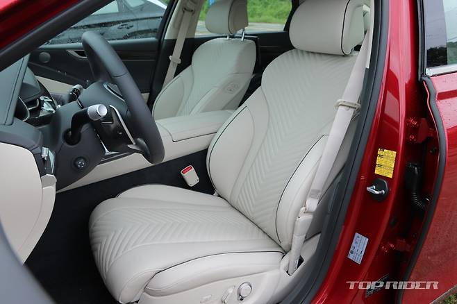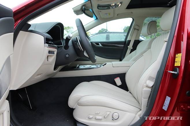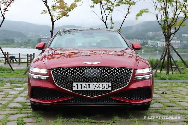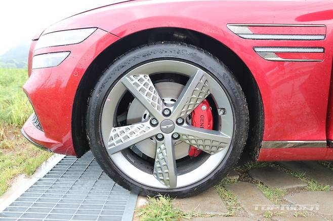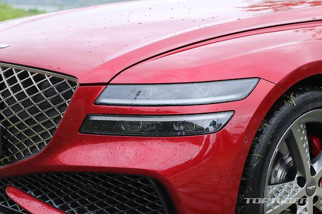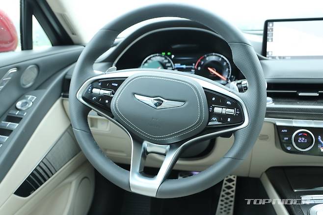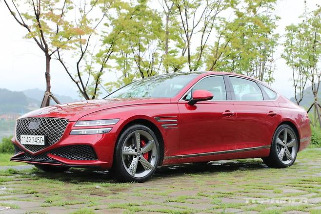 G80 스포츠 전용 외장 컬러는 캐번디시 레드다. 시승차의 외장 컬러는 블레이징 레드로 캐번디시 레드보다 좀 더 밝다. 실내에는 스포츠 전용 다이아몬드 패턴 혹은 V 패턴이 사용된 시트가 적용됐다. 스포츠 전용 3-스포크 스티어링 휠은 버튼 주변에 지문이 잘 남는다.