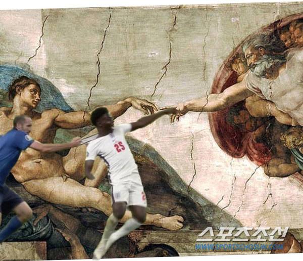 사카 앞에는 유로2020 우승컵이 놓여있다. '우승컵을 향해 달리는 사카의 돌파를 저지했다' 정도로 해석이 가능하다.