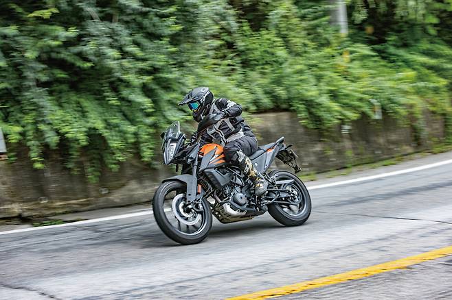 초반 움직임은 익숙하다. 390 듀크에 비해 상체가 조금 더 세워졌다는 느낌이 들 뿐 이질감이 없다. 1단 기어비가 짧아서 더 경쾌한 출발이 가능했다. 엔진은 출발 이후 3,000rpm 부근부터 도톰한 토크가 실리고 7,000rpm 영역에서 한 번 더 밀어주는 세팅이다. 전체적으로 매끄럽게 출력이 나오기 때문에 부담 없이 스로틀을 열 수 있고 초반 탄력을 잘 살리면 높은 회전수까지 사용하지 않아도 여유롭게 가속할 수 있다. 특히 옵션으로 추가된 퀵시프트는 변속 시 클러치를 잡을 필요가 없어서 매우 편리하다. 다운시프트 상황에서는 자동으로 레브 매칭을 해주고 과도한 백 토크가 걸리면 슬리퍼 클러치가 수습한다. 업시프트를 연속으로 하며 가속할 때 기어 레버를 발등에 살짝 걸고 조작하거나 rpm의 한계점에서 변속하는 경우 퀵시프트가 작동하지 않기 때문에 정확한 조작이 필요했다. 물론 시승차량은 주행거리가 짧은 신차 컨디션이라는 점을 고려하고 미션도 길이 들면 더 부드럽게 조작할 수 있을 것이다.
